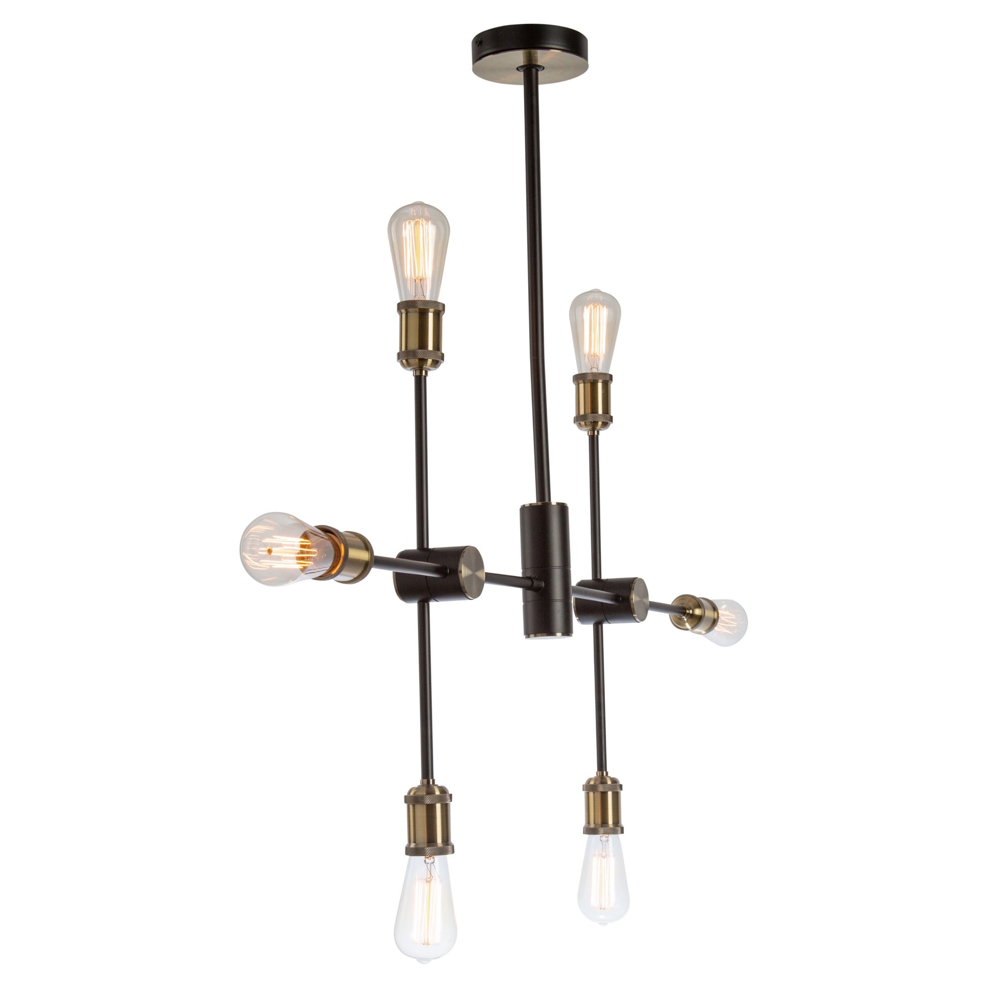 Modular in design, the "Tribeca" series elegantly adopts the beauty of retro Edison bulbs (not included). This version has a trendy two tone color factor. The frame is matte black while the socket cover, arm connectors, and part of the canopy are in plated satin brass. An instant classic which brightens up any area. 6 light chandelier shown - other size also available. Comes with hang straight for sloped ceilings and multiple rods for desired height.