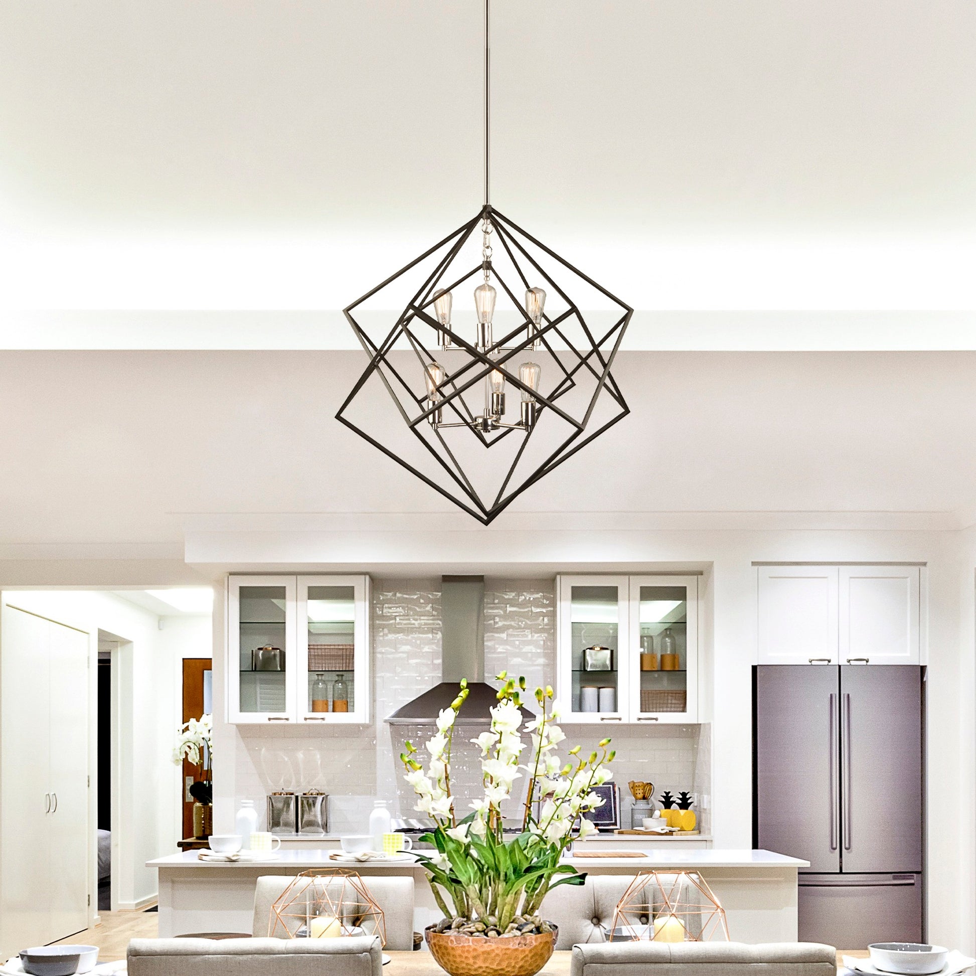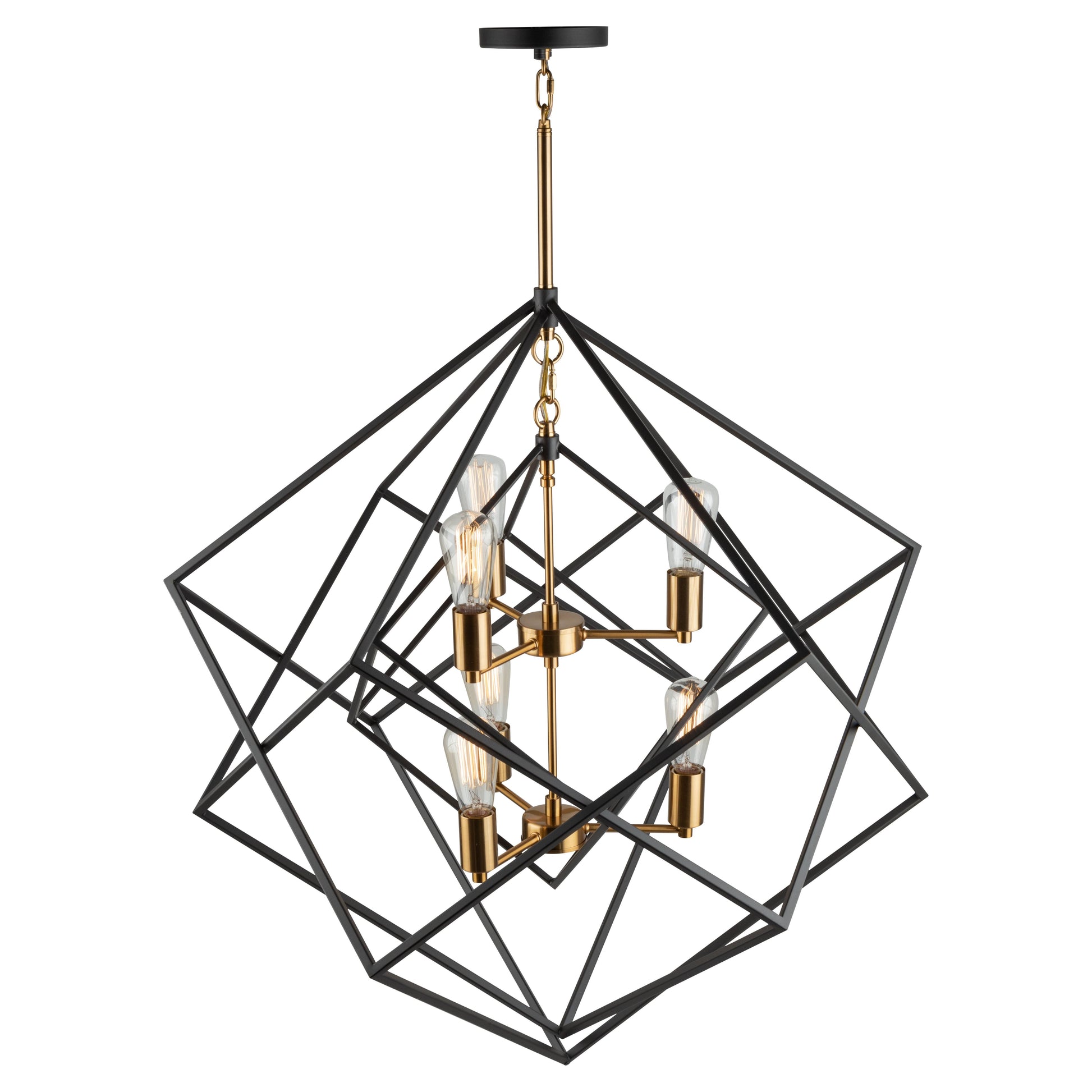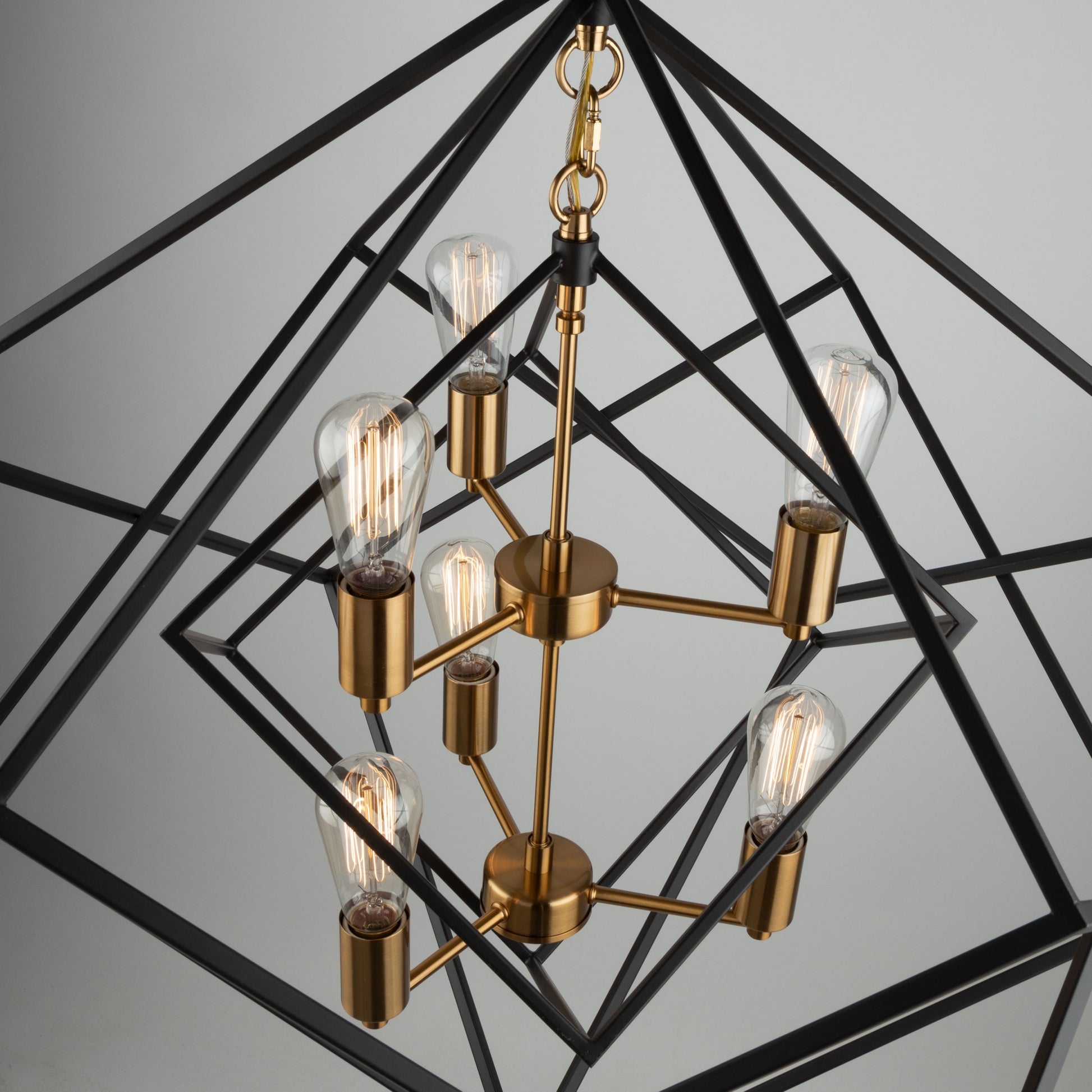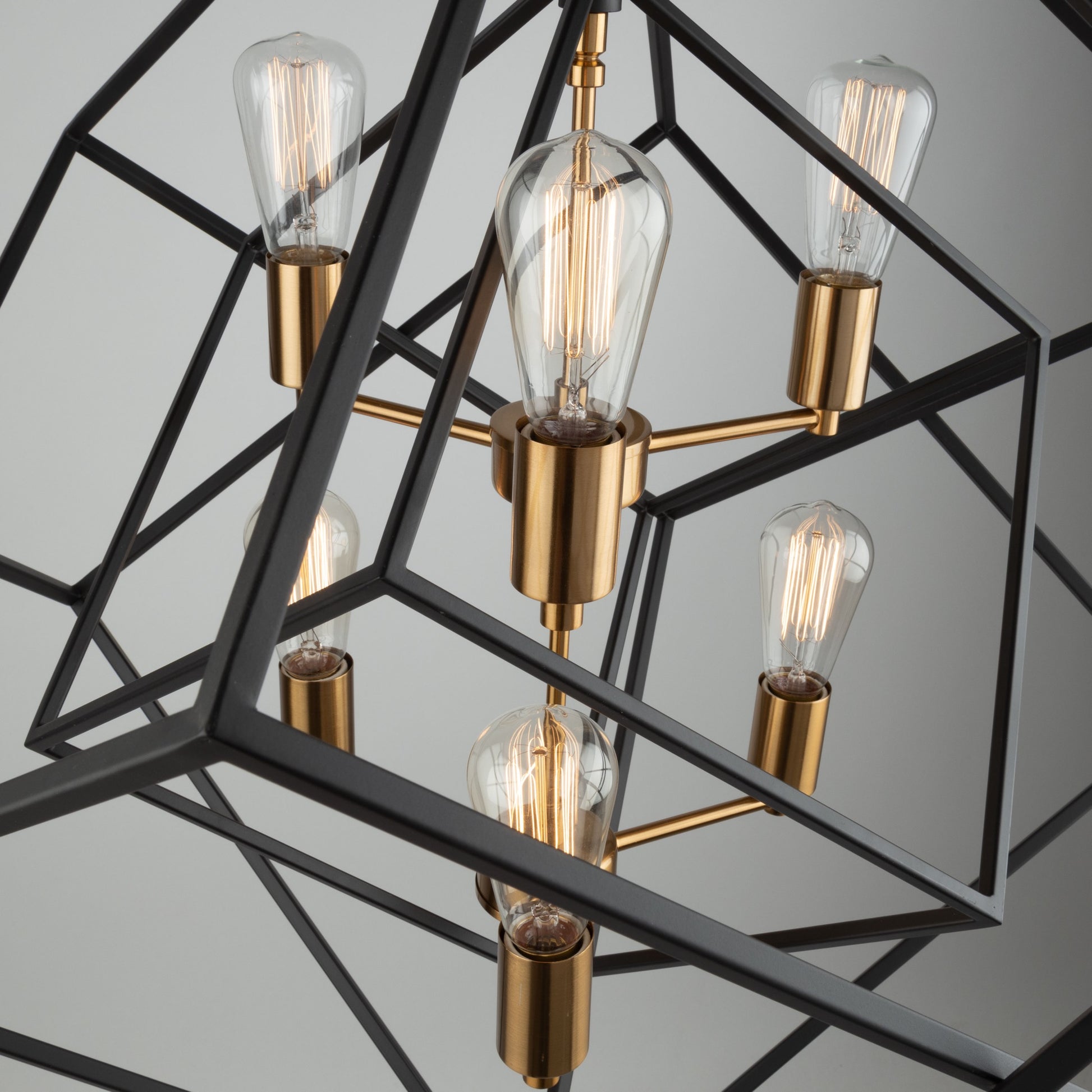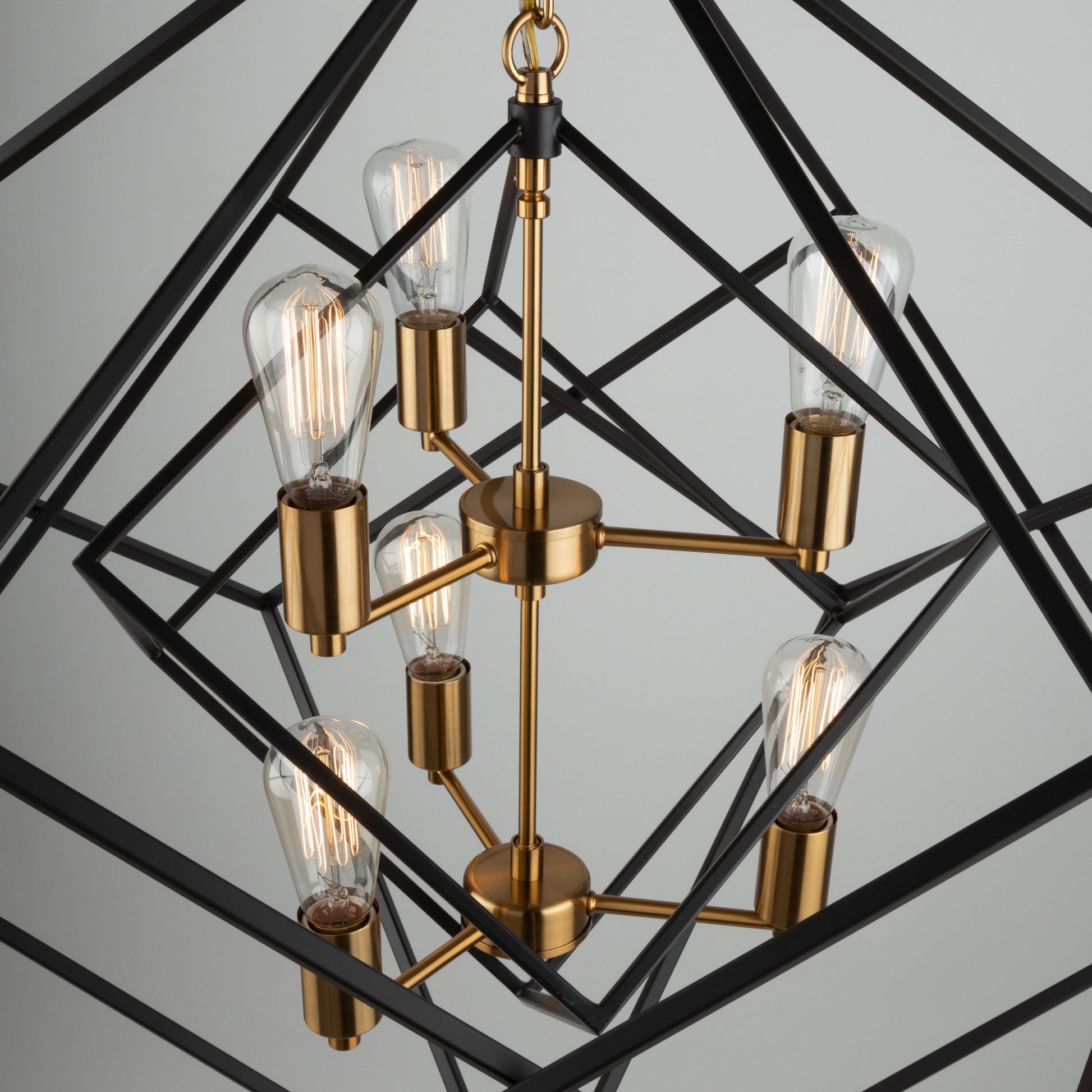 Stunning in design, this two tone multiple square chandelier from the "Artistry" collection is an instant classic. The interior has a satin brass frame, while the exterior frame is a matte black finish. Multiple rods included with hangstraight for sloped ceilings. (Larger sizes available)