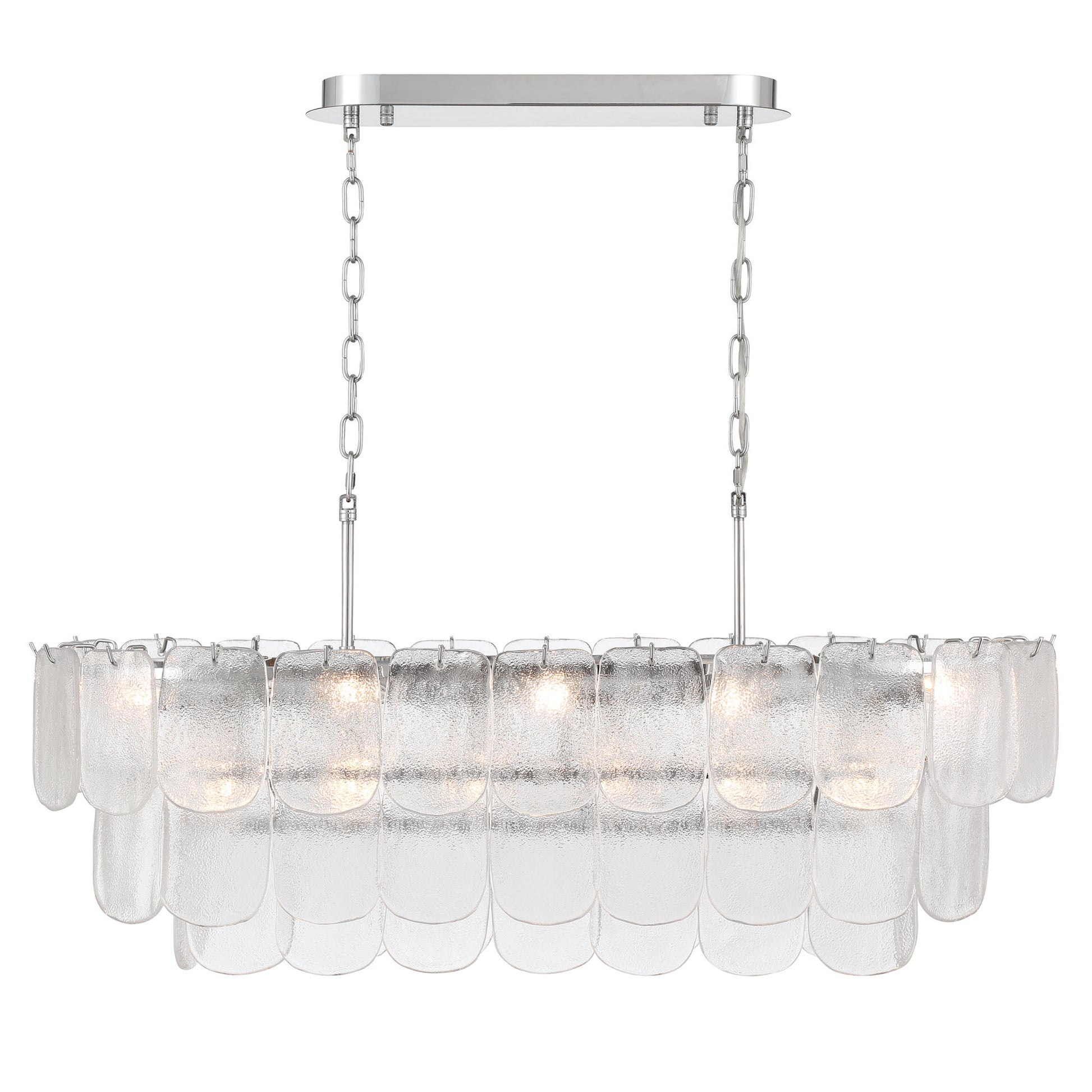 The linear island type chandelier from the Bianca collection exudes elegance with its cascading clear “Piastra” glass panels that shimmer like delicate ice sculptures. (The top row of glass features smoke panels with the balance of the frame has clear glassware). These textured glass elements are gracefully suspended from a polished nickel frame, radiating a sense of refined artistry and grace. A perfect addition to any dining room with rectangular table or perhaps in a kitchen over an island.
