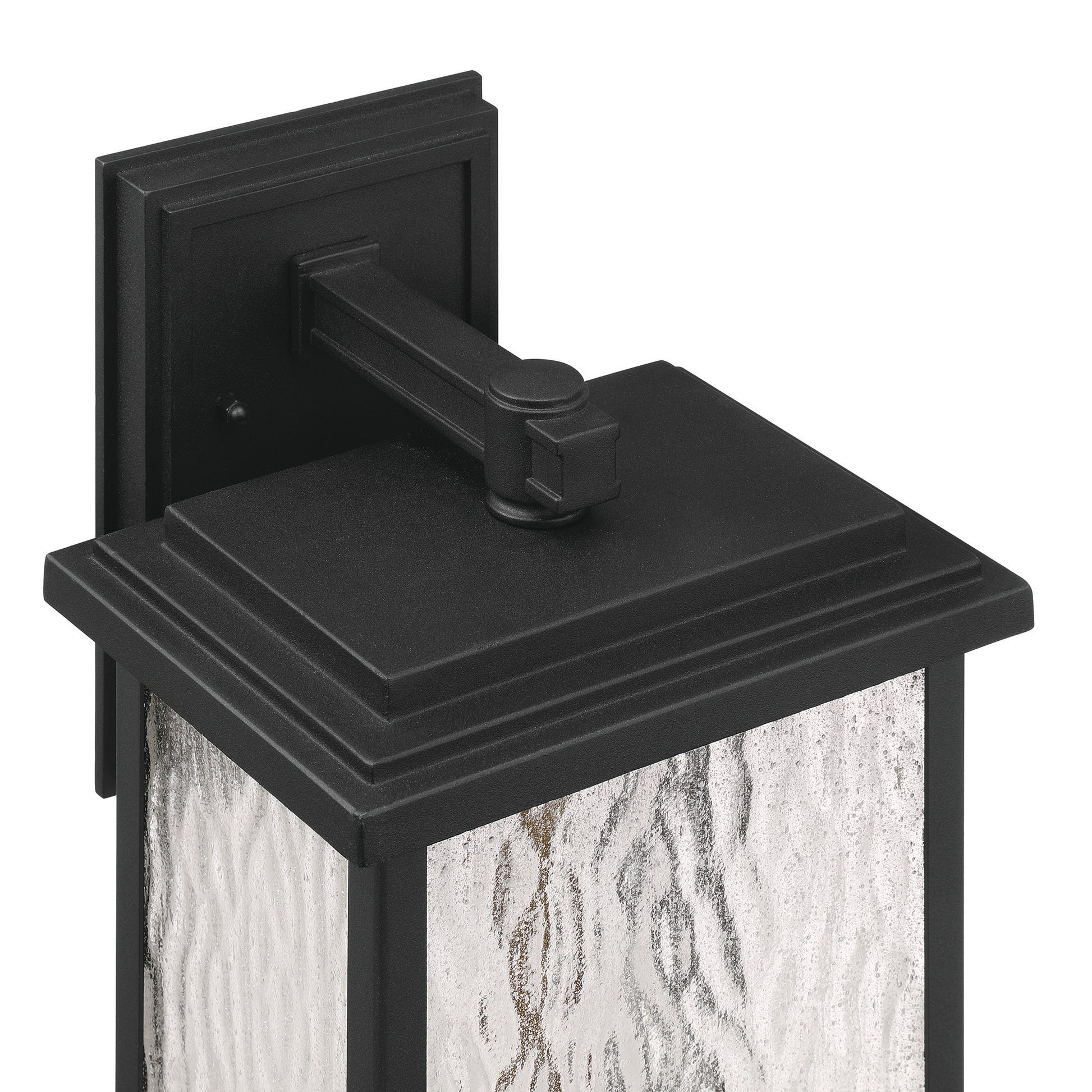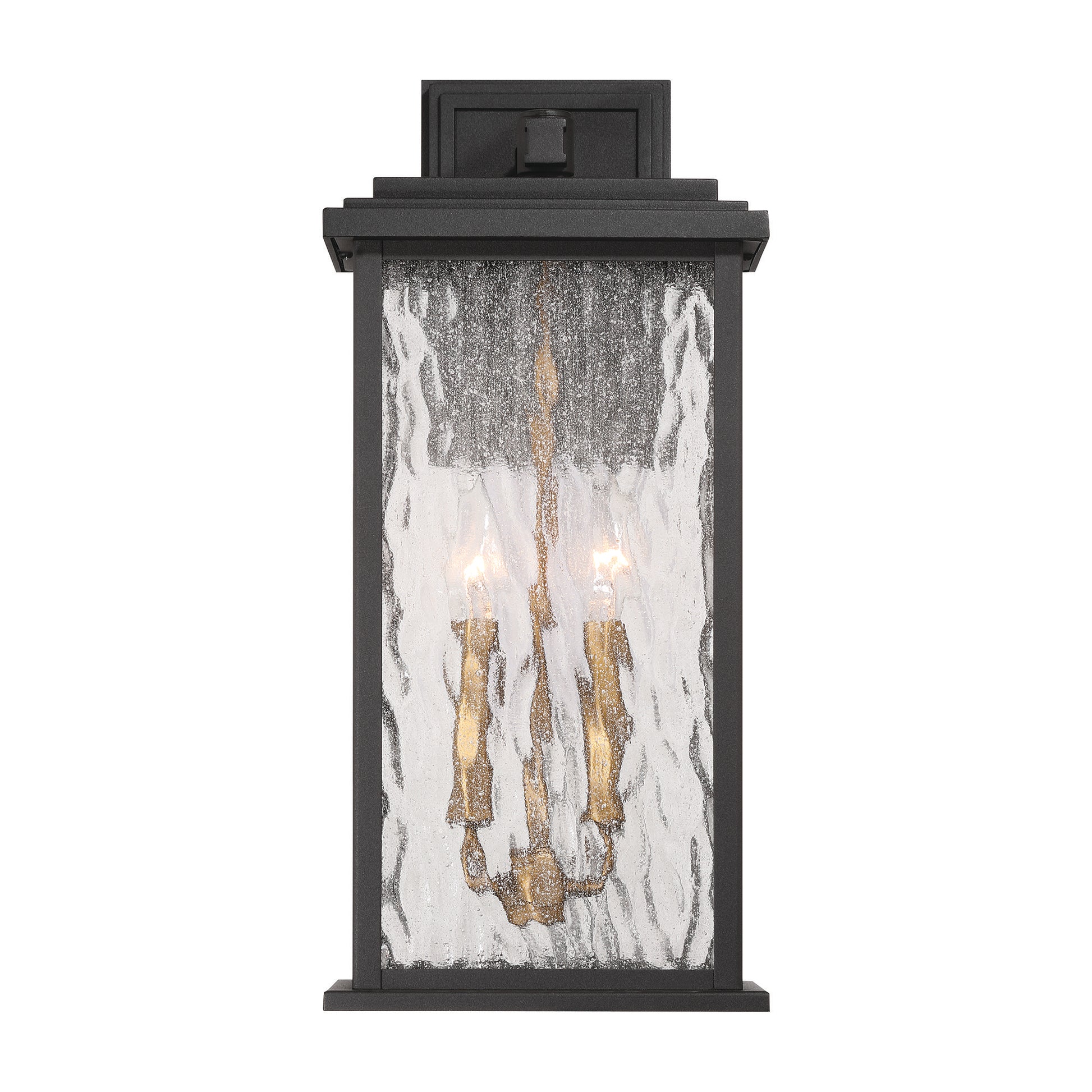The “Estate” Collection outdoor wall sconce radiates classic allure, with its black metal frame offering a striking contrast to the mesmerizing water glass panels. Encased within, vintage brass candle covers and intricate metalwork glow warmly, evoking a sense of nostalgic charm. Perfect for enhancing any outdoor space, this sconce blends classic sophistication with modern durability.