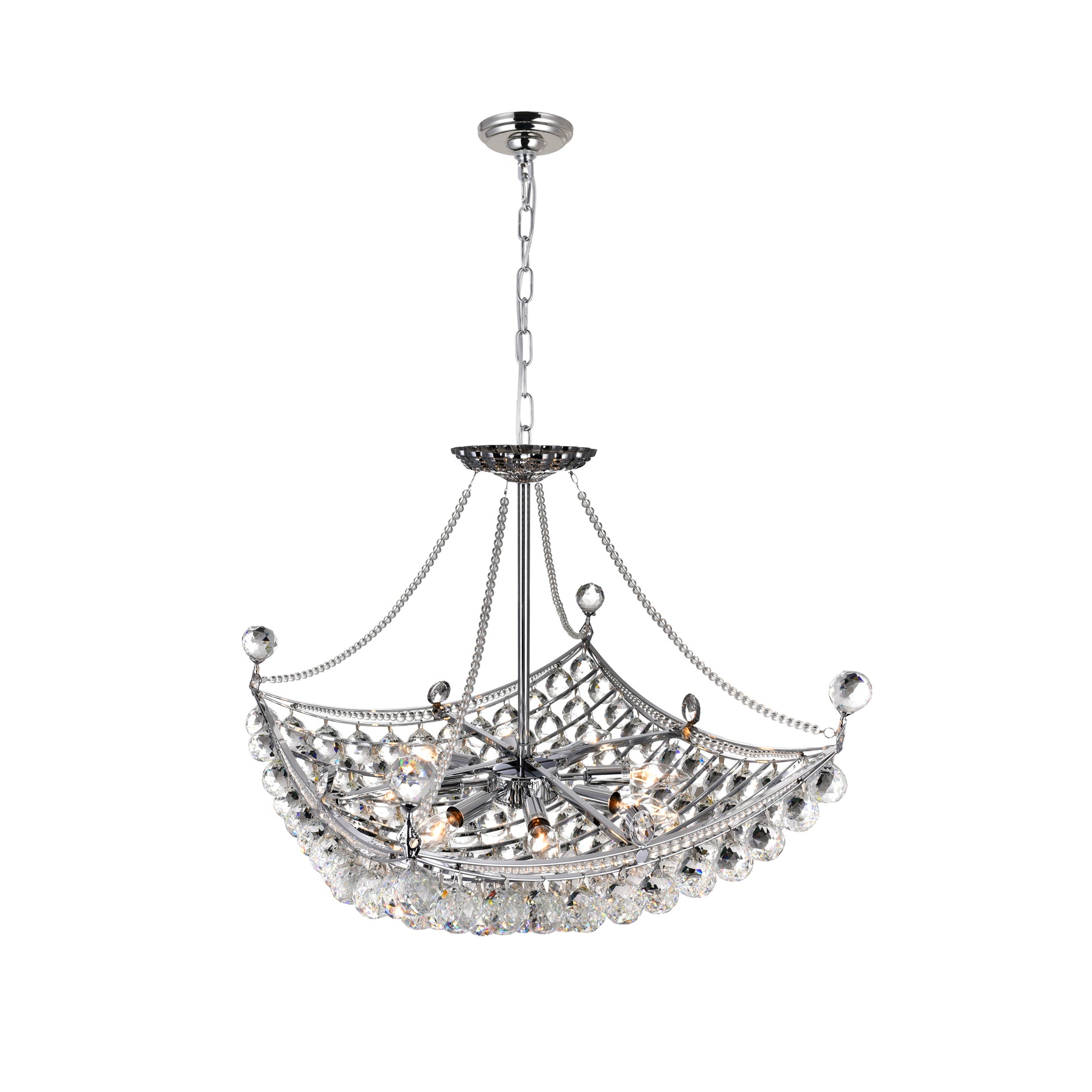 A statement-making chandelier, the Jasmine 8 Light Chandelier can enhance your dining space with its ornamental structure and glittering diffused light. This down chandelier is designed with a chrome-finished candelabra base with a basket of dangling crystal balls radiating light that is soft and warm yet still elegant.