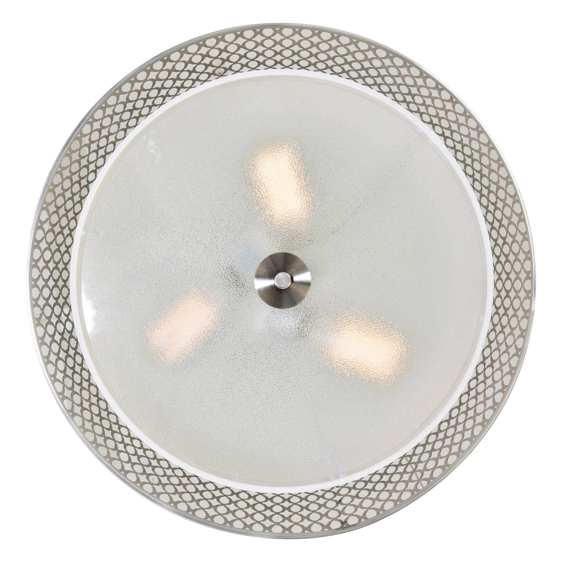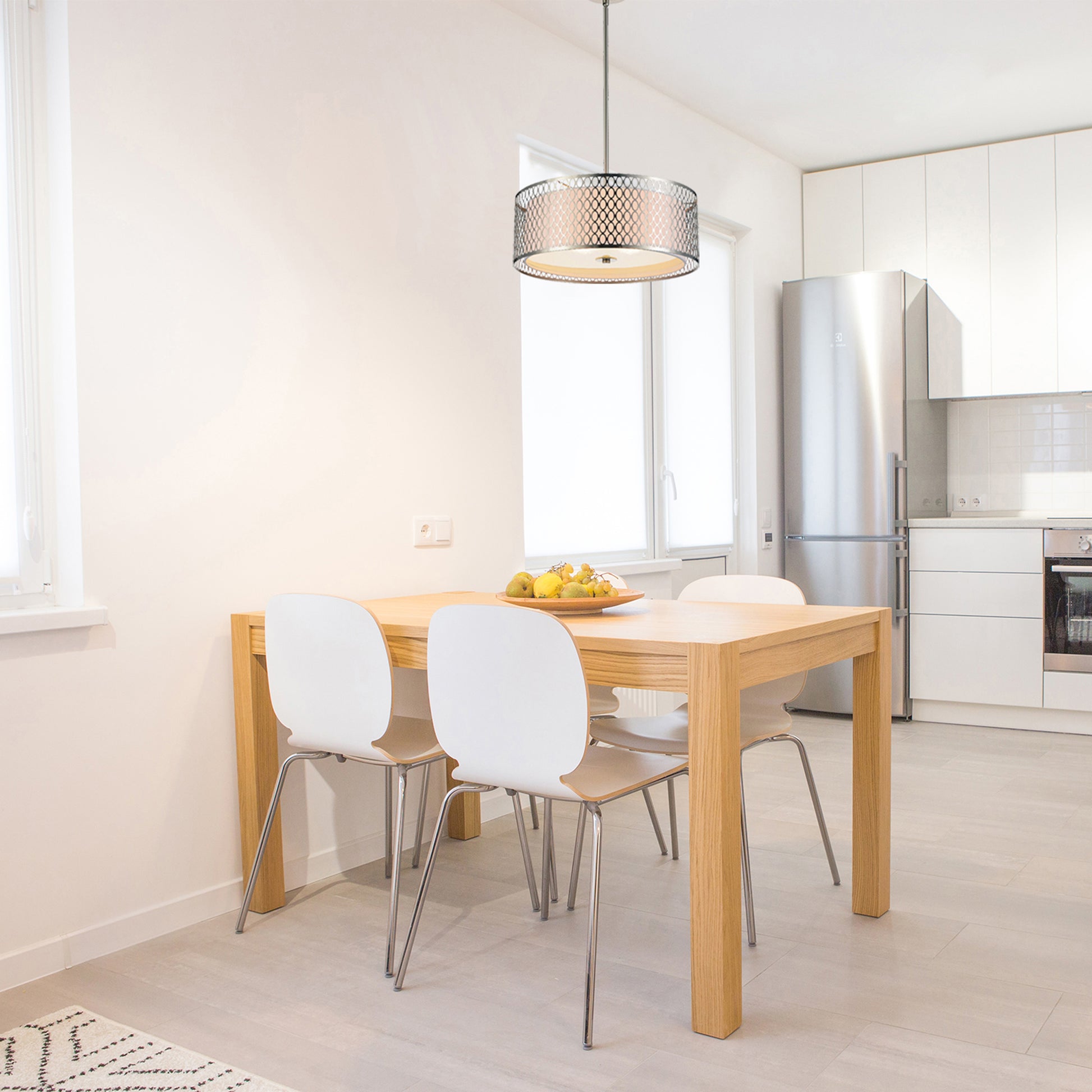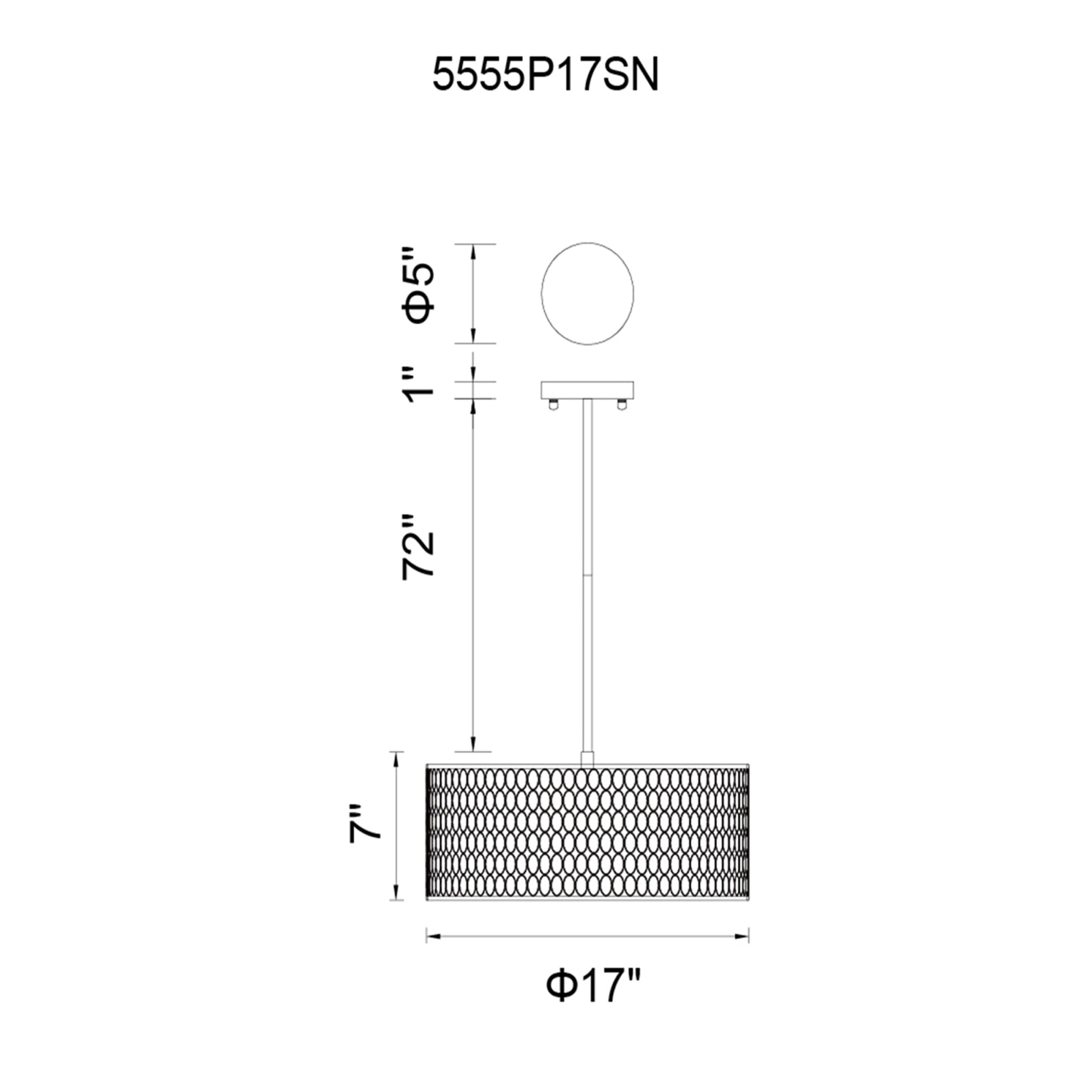 Add dimension and detail to a space with the Mikayla 3 Light Chandelier. This satin nickel light fixture is designed with a double drum shade with an outer metal drum measuring 17 inches in diameter. It features an open framework with circular lattice pattern. The inner shade is in solid off-white and diffuses light that is warm, soft, and guaranteed to delight.
