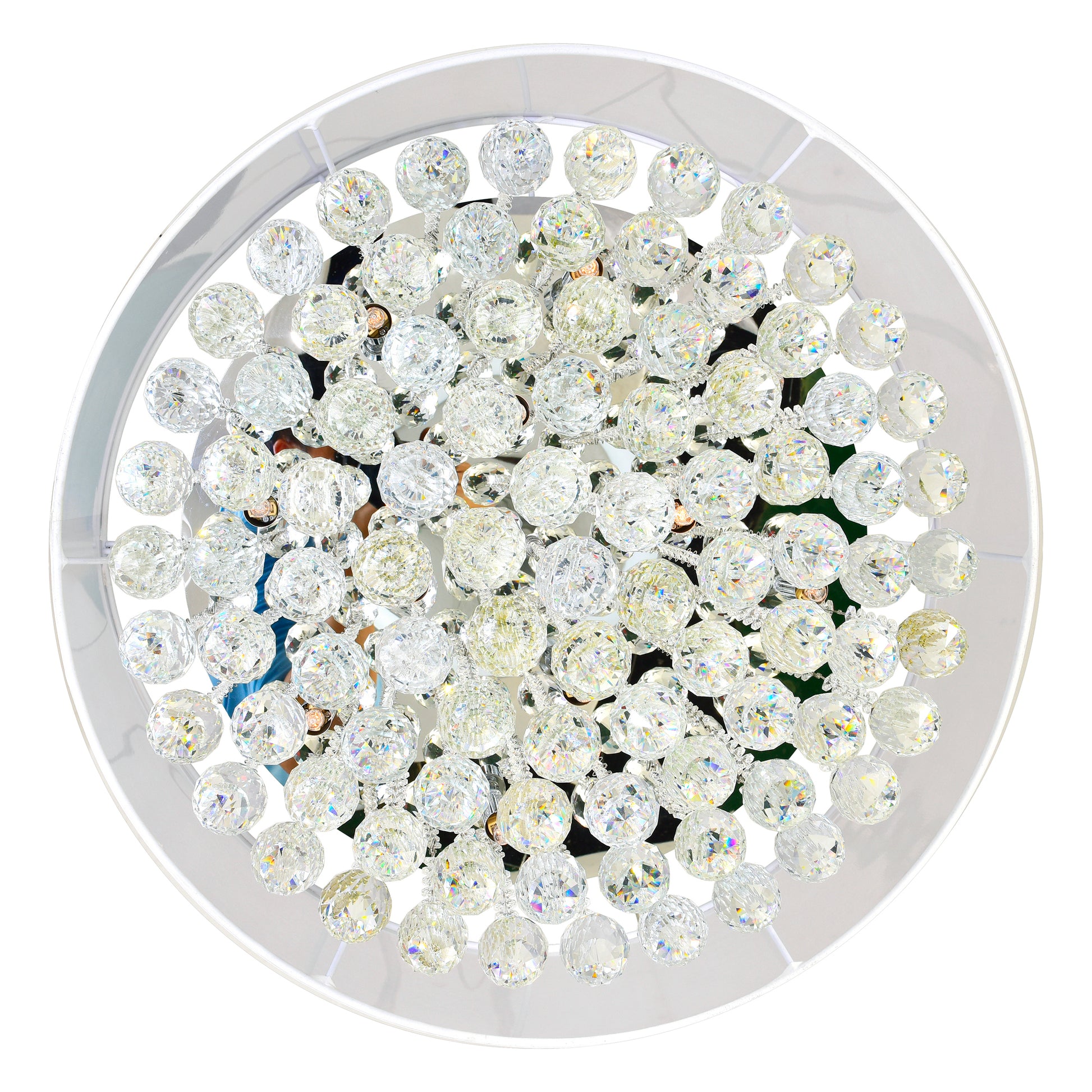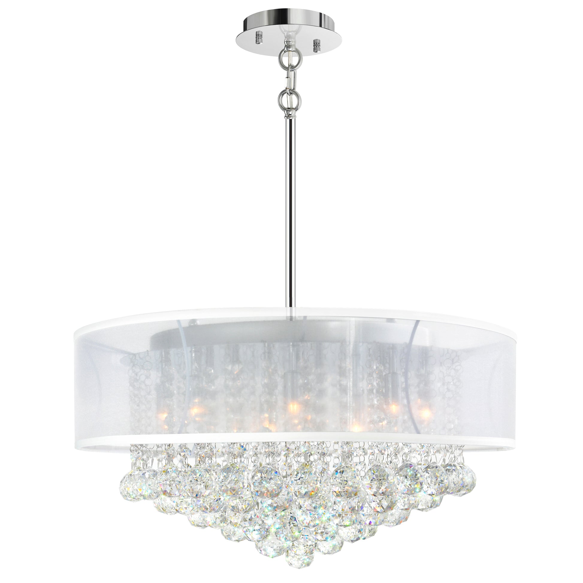 A chic crystal chandelier choice for a modern or contemporary space. Besides adding panache, the 24" Radiant 12 Light Chandelier can make a room feel more bright yet intimate. The strands of clear crystals encased inside a transparent white shade provide diffused glittering light that will bring a graceful glow to a space. This light source is a fabulous fixture that will look perfect in the dining room or kitchen.